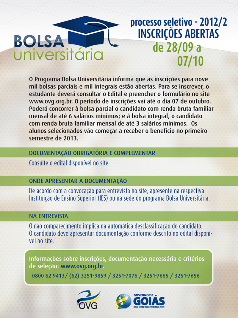 Bolsa Universitária - Inscrições abertas até 07/10/2012